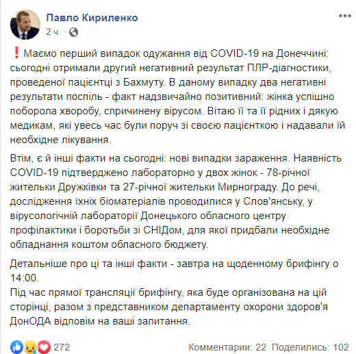 Также он сообщил, что есть первый случай выздоровления от Сovid-19 в Донецкой области. Кириленко поздравил выздоровевшую пациентку и ее родных и поблагодарил медиков, которые все время были рядом с пациенткой и оказывали ей необходимое лечение.