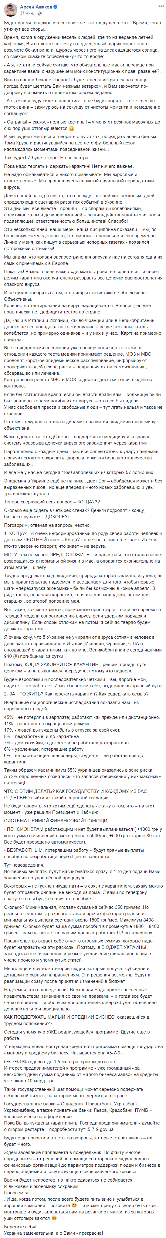 "Девять дней назад я писал, что нас ждут важнейшие несколько дней, определяющих сценарий развития событий в Украине. Эти дни мы- все вместе - прошли – со спорами и колебаниями, политиканством и дезинформацией – разгильдяйством кого-то из нас и подавляющей ответственностью большинства! Спасибо! Эти несколько дней, наши меры, наша дисциплина показали – мы, по большому счету сделали то, что смогли – правильно и своевременно.