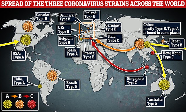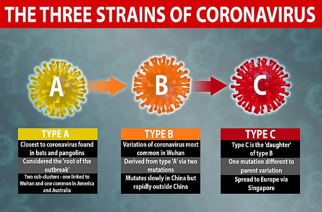 Условно они выделили три типа - А. В и С. Тип А - это исходный вирус, который передался людям от летучих мышей. Другие два типа - это его мутации.