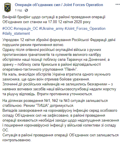 "В течение 12 апреля вооруженные формирования Российской Федерации дважды нарушили режим прекращения огня", - сообщили в пресс-центре.