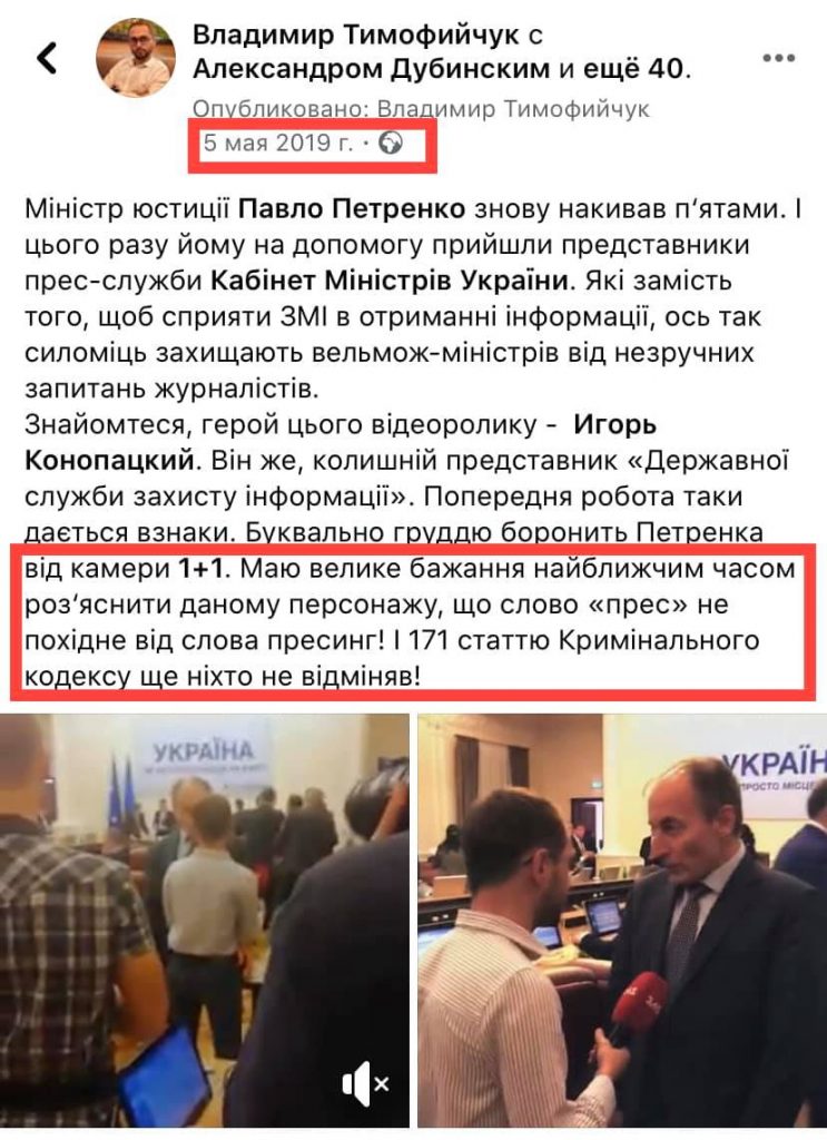 Как отмечается, в мае 2019 года Владимир Тимофийчук обратился в Национальную полицию с заявлением о препятствовании профессиональной деятельности со стороны главного специалиста Секретариата Кабинета Министров Украины Игоря Конопацкого. А телеканал "1+1" направил тогдашнему премьер-министру Украины Владимиру Гройсману официальное письмо с требованием провести служебное расследование относительно действий работника Кабмина, который набросился на журналиста, устроив потасовку, и сорвал съемку в правительственном помещении. В Национальном союзе журналистов Украины тогда осудили поведение чиновника, который нагло препятствовал работнику СМИ.