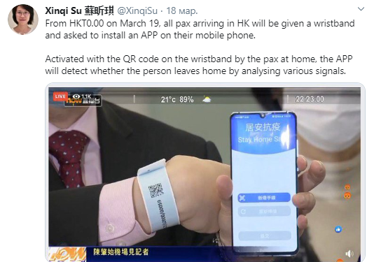 В Гонконге, пребывающим в режиме карантина на дому, вообще надевали браслеты, которые передавали сигнал приложению на телефоне. Периодически с ним нужно было делать селфи.