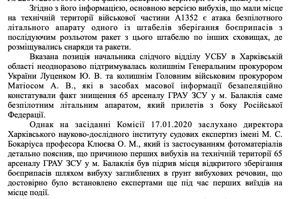"На заседании Комиссии 17 января 2020 года был выслушан директор Харьковского научно-исследовательского института судебных экспертиз имени Н.С.Бокариуса профессор Клюев А. М., который с применением фотоматериалов подробно объяснил, что причиной первых взрывов на технической территории 65 арсенала ГРАУ ВСУ в городе Балаклея был подрыв места открытого хранения боеприпасов путем взрыва заглубленных в грунт взрывчатых веществ, что достоверно было установлено экспертами еще во время первых выездов на место происшествия", – говорится в тексте документа.