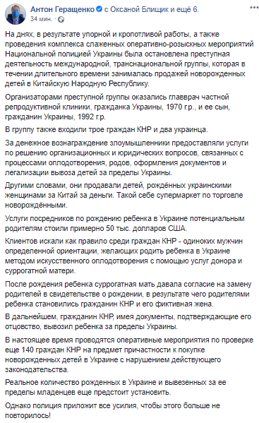 Как сообщил замминистра МВД Антон Геращенко, новорожденных продавали в Китай. Организаторами преступной группы оказались главврач частной репродуктивной клиники, гражданка Украины, 1970 г.р., и ее сын, гражданин Украины, 1992 г.р. В группу также входили трое граждан КНР и два украинца.
