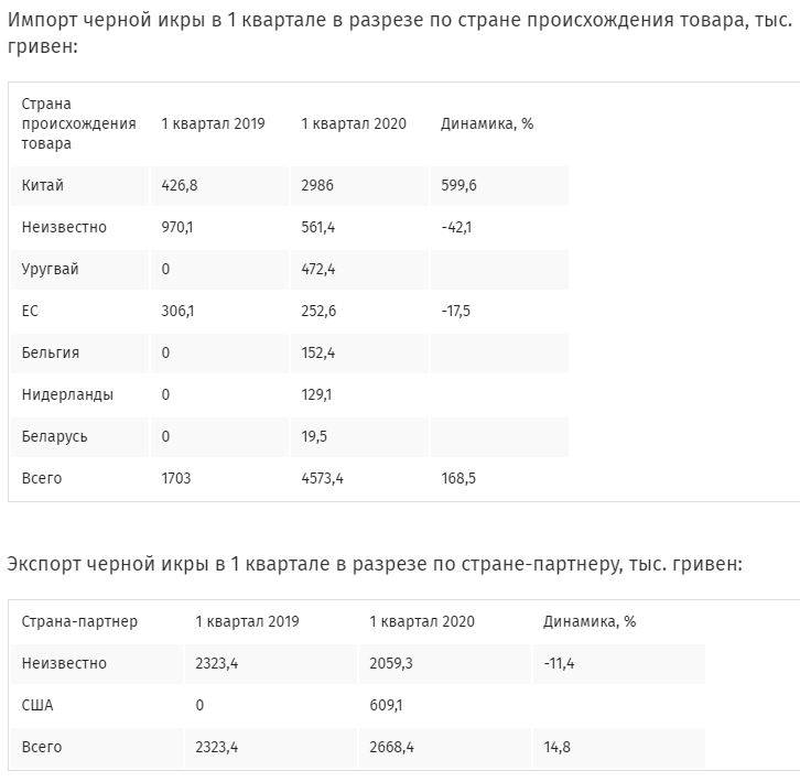 В январе-марте по сравнению с аналогичным периодом 2019 года, импорт черной икры вырос на 168,5%, или на 2,87 млн гривен до 4,573 млн гривен, а экспорт этой продукции – на 14,8%, или на 0,345 млн гривен до 2,668 млн гривен.