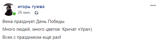 19:32 Вена празднует День Победы. Много людей, много цветов. Кричат "Ура"