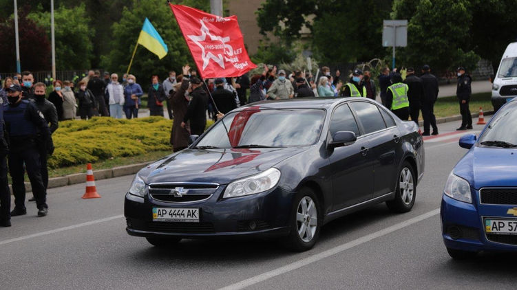 В Запорожье началась стычка из-за автопробега с советскими флагами к 9 Мая. Фото: 061