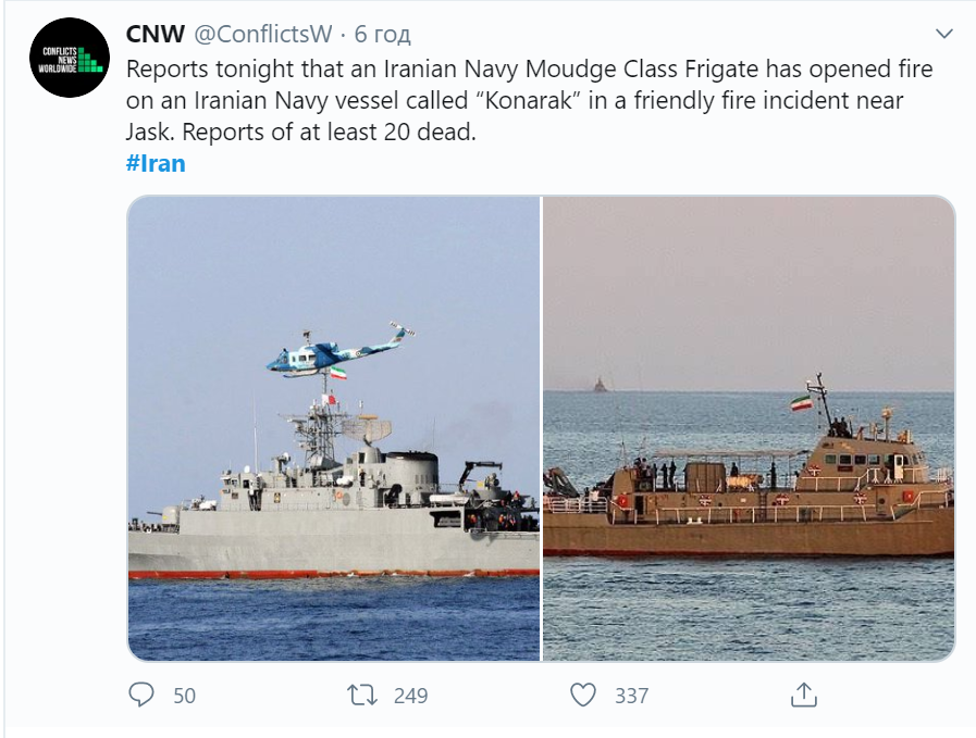Эсминец выпустил противокорабельную ракету, которая угодила во вспомогательное судно Konarak. По данным Бахтиари, поврежденный корабль затонул. СМИ сообщают, что погибли от 20 до 40 человек. Также есть информация о десятках пострадавших. Официального подтверждения инцидента со стороны иранских военных пока нет.