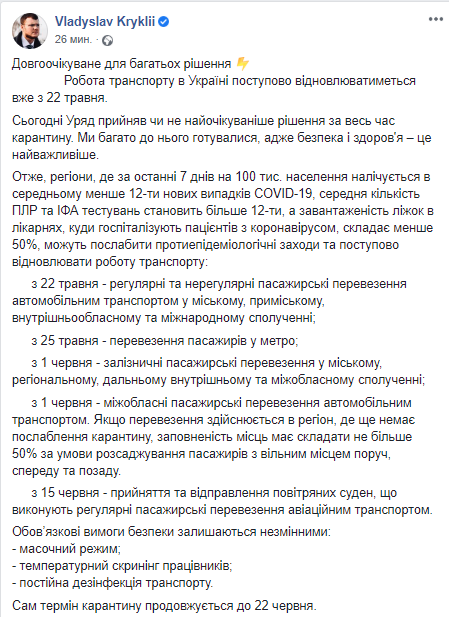14:22 Тем временем нардеп Алексей Гончаренко пишет: "С 22 мая открывается городской и пригородный транспорт, запускаются отели (без ресторанов и бассейнов), разрешаются спортивные мероприятия без зрителей. С 25 мая открывается метро и детсады".