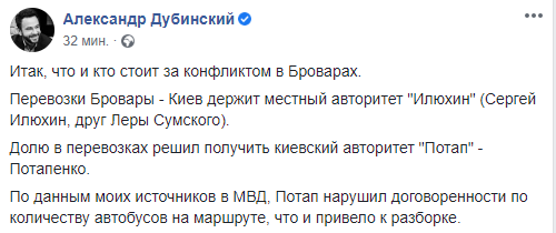 "Итак, что и кто стоит за конфликтом в Броварах. Перевозки Бровары - Киев держит местный авторитет "Илюхин" (Сергей Илюхин, друг Леры Сумского).