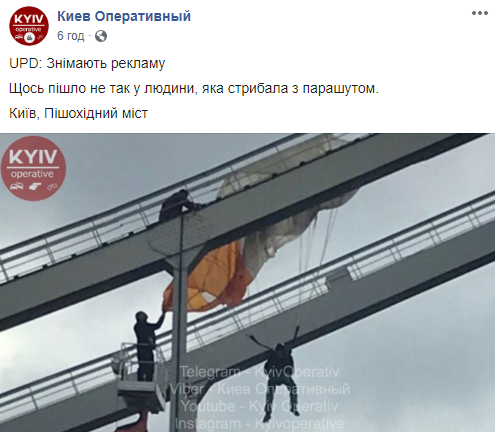В Киеве парашютист зацепился и повис на мосту. Фото: Киев оперативный