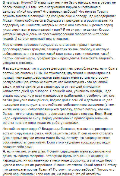 "Многие задаются вопросом, почему бандиты и мародеры так спокойно грабят бутики, тащат домой бриллианты, дорогущие сумки, ролексы, эпплы, обувь и нигде нет полицейских. Они ставят на колени белых и требуют прощения, и тогда им сохранят жизнь. Мы который день сидим дома и с началом темноты боимся, а не идет ли в нашу сторону одичавшая толпа. Комендантский час, впервые введенный в Нью-Йорке с 1943 года, они не соблюдают, никто их не останавливает, не арестовывает, не наказывает. Полицейские лишь тушат пожар в мусорке и помогают подняться упавшим. Как же так?" - пишет Славина.