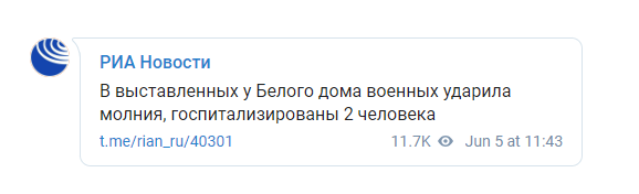 "В выставленных у Белого дома военных ударила молния, госпитализированы 2 человека", - говорится в сообщении.