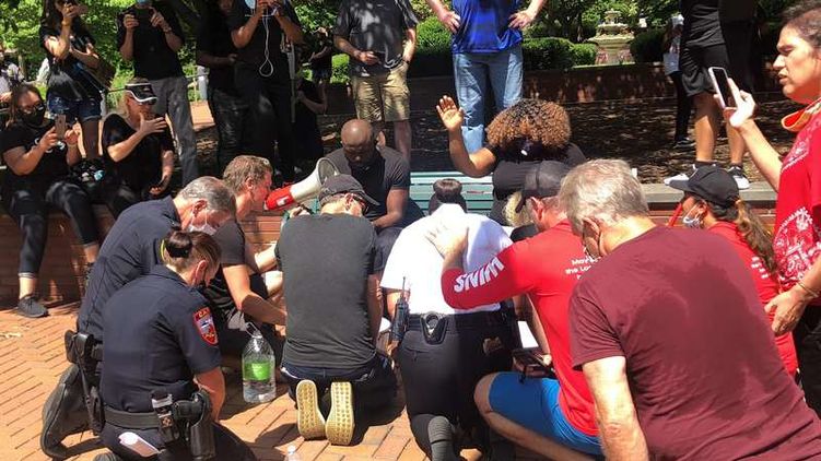 Во время остановки для молитвы несколько белых участников шествия (в том числе и полицейские) стали на колени и омыли ноги темнокожим лидерам церкви - пасторам Джеймсу и Фейт Вокоме.