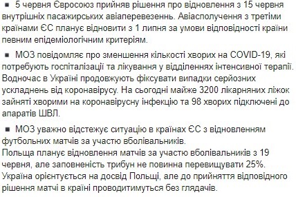 Кроме того, в Минздраве напомнили о возобновлении международных авиаперевозок с 15 июня в Украине и Европейском союзе и о перелетах в страны третьего мира с первого июля.