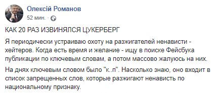 Также перед удалением аккаунта журналист направлял в Facebook десятки жалоб на разжигание ненависти по национальному признаку. Украинские модераторы соцсети поначалу не реагировали. Однако после подачи апелляций Facebook все-таки удалял спорный контент, и даже приносил извинения.