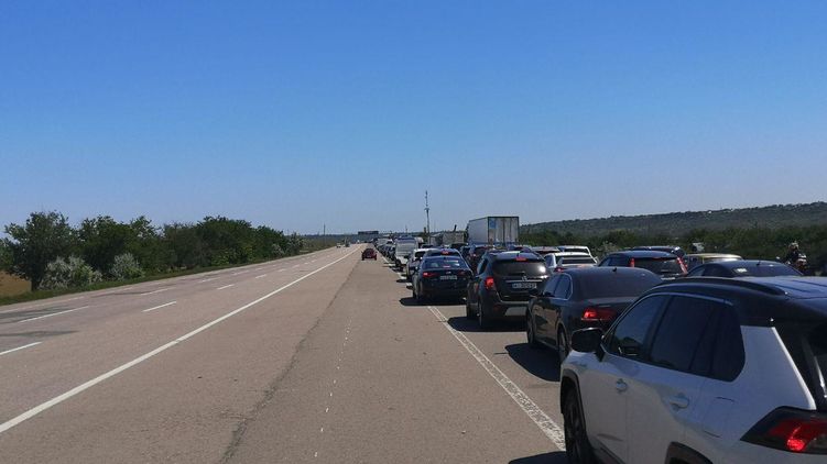 Так, пробки обсуловлены тем, что для проезда открыта лишь одна полоса трассы. Люди в условиях летней жары вынуждены часами стоять на въезде в Одессу.