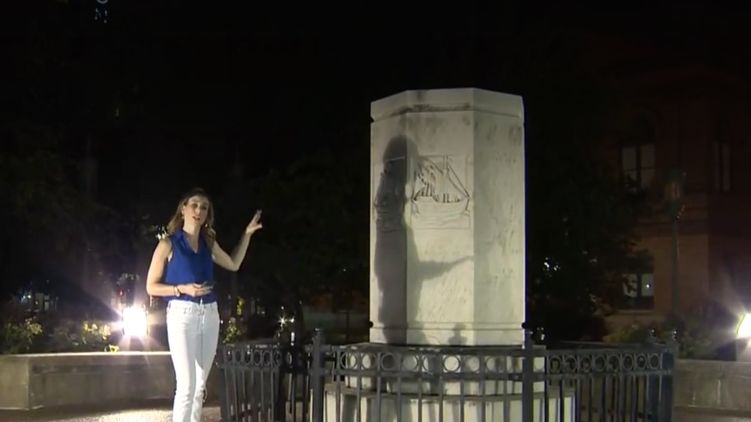 В США неизвестные повалили статую Христофору Колумбу. Скриншот: baltimore.cbslocal.com
