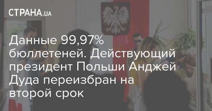 Действующий лидер Польши Анджей Дуда получил большинство во втором туре президентских выборов. За него проголосовали 51,21% избирателей.