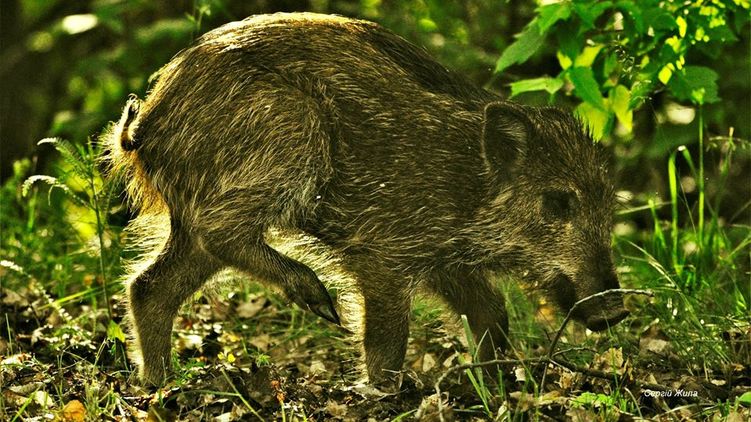 На одном снимке запечатлен поросенок. Он был настолько занят поиском вкусной пищи, что не заметил приближения ученого. Сотруднику удалось сделать фото с расстояния ближе 10 метров. Молодое животное смешно отмахивалась задней конечностью от комаров. Рядом под дубом были замечены еще шестеро поросят в хорошей физической форме.