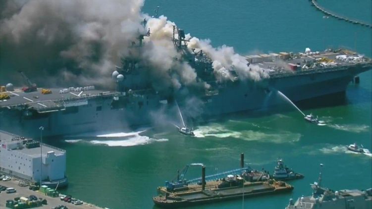 На военно-морской базе в Сан-Диего (штат Калифорния, США) уже более суток продолжается пожар на борту американского универсального десантного корабля USS Bonhomme Richard (LHD 6) ("Боном Ричард"). Его тушат пожарные суда и три вертолета, впрочем, погасить пламя пока не получается.