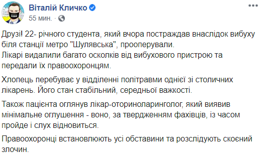 "22-летнего студента, который вчера пострадал в результате взрыва у станции метро "Шулявская", прооперировали.