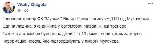 "Единственный человек, выживший в автомобиле Mazda - жена тренера. Также в автомобиле было двое детей 11 и 13 лет - они также погибли. Информацию неофициально подтверждают в больнице Мукачево", - пишет журналист.