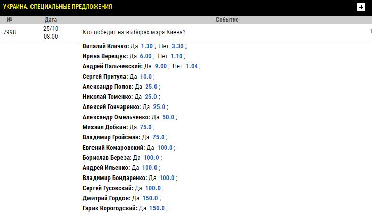 Отметим, что букмекеры принимают ставки и на таких кандидатов в мэры Киева, как Дмитрий Гордон и Гарик Корогодский. На их победы дают коэффициент 150.