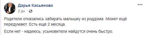 "Родители отказались забирать малышку из роддома. Может ещё передумают. Есть ещё 2 месяца. Если нет - надеюсь, усыновители найдутся очень быстро".