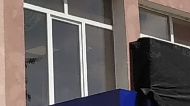 В результате выстрела повреждено окно на втором этаже здания Главного управления Нацполиции в Луцкой области. Фото: Волынь
