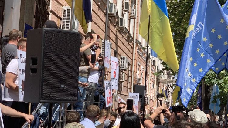 "Страна" сообщала о том, что утром 23 июля в Киеве у суда представители Нацкорпуса и сторонники Порошенко собирались в поддержку "порохобота", облившего зеленкой нардепа Волошина.