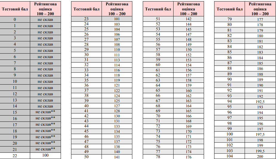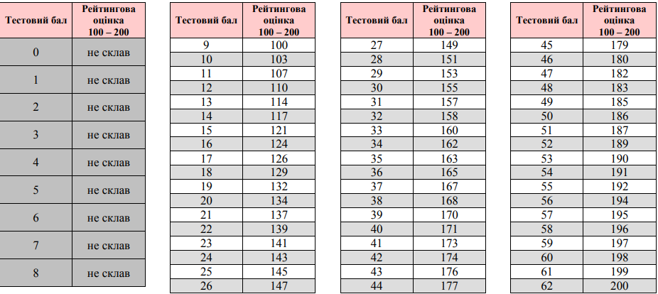 Таблица перевода тестовых баллов по украинскому языку и литературе в рейтинговую оценку (по шкале 100 - 200 баллов)