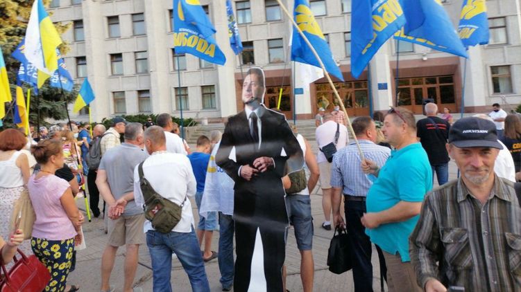 Один из участников принес на митинг на импровизированной удочке картонную фигуру президента Украины Владимира Зеленского, подвешенную за шею, сообщает городской сайт 0532.ua.