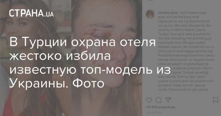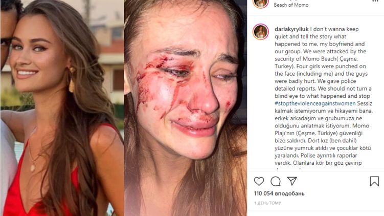 "Я не хочу молчать и рассказываю историю, что случилась со мной, моим парнем и нашей группой. На нас напала служба безопасности пляжа Момо (Чешме, Турция). Четыре девушки были избиты по лицу (включая меня), и парни сильно пострадали. Мы дали полиции подробные отчеты. Мы не должны закрывать глаза на то, что произошло", - написала Дарья Кирилюк.