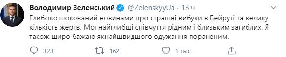 Соболезнования ливанцам в день взрыва выразил президент Владимир Зеленский.