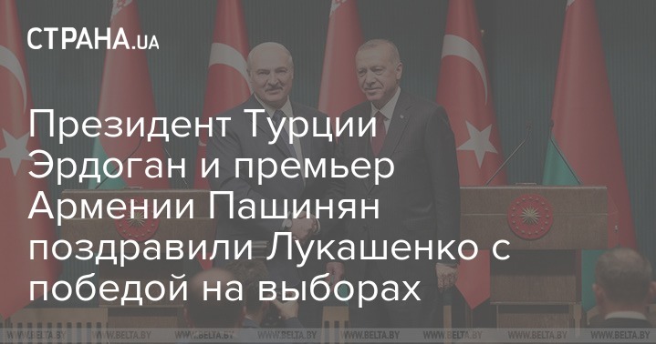 Премьер-министр Армении Никол Пашинян поздравил президента Беларуси Александра Лукашенко с победой на выборах президента страны. Также поздравление направил президент Турции Реджеп Тайип Эрдоган.