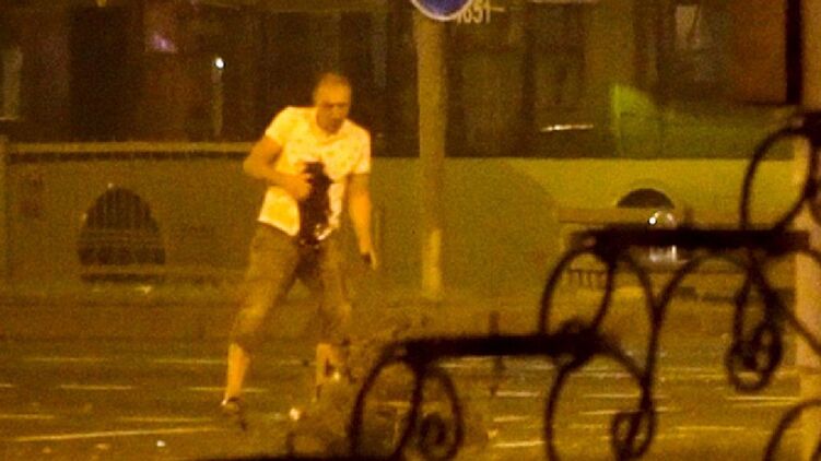 Сообщается, что в понедельник, 10 августа, корреспондент AP Мстислав Чернов снимал видео протестов в Минске. Ему удалось запечатлить мужчину в белой футболке с красным пятном, который стоит напротив правоохранителей.