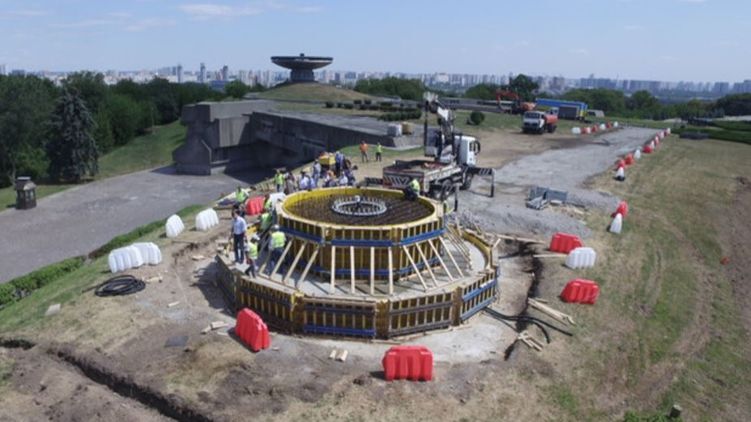В Киеве начали устанавливать флагшток, на который установят самый большой флаг страны. Сооружение возводится на территории Мемориального комплекса "Национальный музей истории Украины во Второй мировой войне" около "Родины-матери".