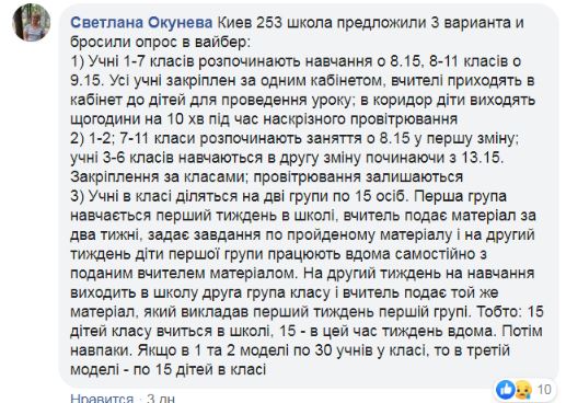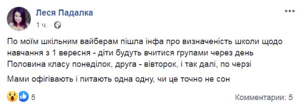 Так, журналистка Леся Падалка написала, что в ее родительский чат в Вайбере пришла информация, что в школе решили обучать детей 1 сентября группами через день.