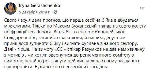 "Он (Бужанский. – Ред.) забежал в сектор "Европейской солидарности", затащил его (Лероса. – Ред.) за колонны, и нашим депутатам пришлось останавливать драку", – написала Ирина Геращенко в "Фейсбуке".