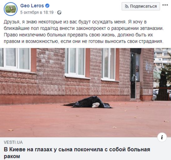 О потенциальном законопроекте депутат сообщил, комментируя новость о том, что в Киеве покончила с собой онкобольная женщина, выбросившись из окна. Отвечая на комментарий о том, как будет решаться вопрос с детской эвтаназией, нардеп написал, что перед тем как закон отправится в парламент, планируются широкие обсуждения.