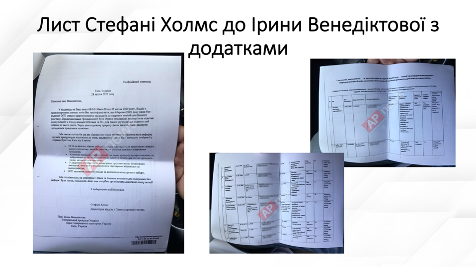 Деркач опубликовал письмо директора департамента по правоохранительным вопросам посольства США Стефани Холмс в адрес Венедиктовой. Там указан список "независимых экспертов", которые войдут в кадровые комиссии по отбору украинских прокуроров.