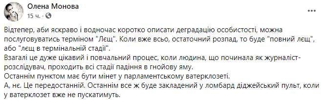 Обрушились на Лещенко и профессиональные порохоботы. Елена Монова заявила, что у бывшего депутата - "деградация личности".