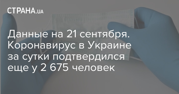 В Украине по состоянию на утро понедельника, 21 сентября, зафиксировано 2 675 новых случаев заражения Covid-19. Таким образом, общее число зараженных выросло в стране до отметки в 178 353 человека.