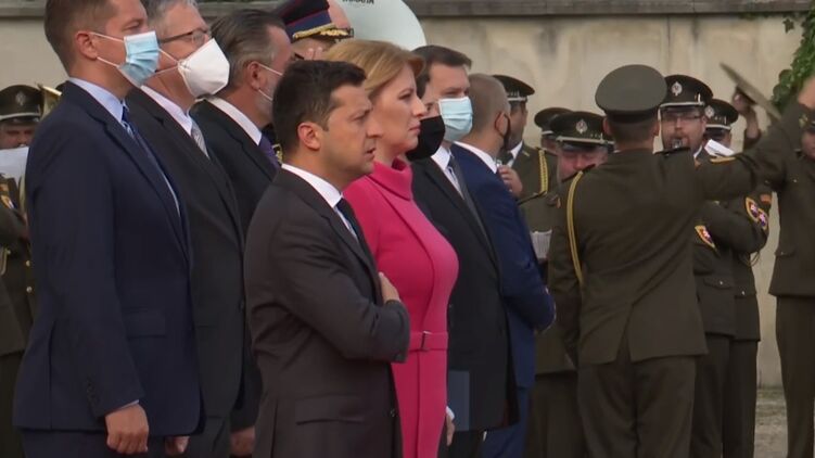 Военный оркестр исполнил государственные гимны Украины и Словакии, после чего Чапутова и Зеленский осмотрели строй воинов Почетного караула. Главы государств также поприветствовали официальные делегации двух стран.