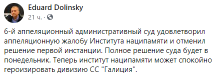 "6-й апелляционный административный суд удовлетворил апелляционную жалобу Института наципамяти и отменил решение первой инстанции. Полное решение суда будет в понедельник. Теперь институт наципамяти может спокойно героизировать дивизию СС "Галиция"", - написал он в Facebook.