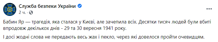 "Сегодня Украина чтит память жертв трагедии Бабьего Яра. Масштабы этого бедствия стали болью не только для Украины, но и для всего мира. Только потому, что кто-то считал себя вправе отнимать жизнь, погибли десятки, сотни тысяч людей. Сколько бы лет ни прошло, мы всегда должны помнить эти страшные страницы истории и делать все от нас зависящее, чтобы такого больше никогда не повторилось ни на территории Украины, ни в любой другой стране мира.