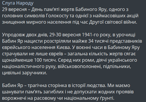 Еще раньше партия "Слуга народа" заявила, что расстреливали людей нацисты. Однако при этом в числе жертв указали и деятелей "украинского националистического движения". Хотя многие из них как раз политику геноцида евреев поддерживали и оправдывали. Упомянуты и подпольщики, но не сказано, к какому "движению" они принадлежали (видимо, потому что многие из них были коммунистами).