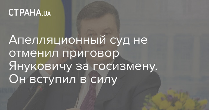 Коллегия судей Киевского апелляционного суда оставила в силе приговор Оболонского райсуда Киева, который заочно приговорил бывшего президента Украины Виктора Януковича к 13 годам лишения свободы за государственную измену. Таким образом приговор вступил в силу.