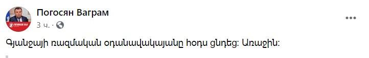 "Военный аэродром в Гяндже взлетел в воздух. Первый", - написал Погосян.